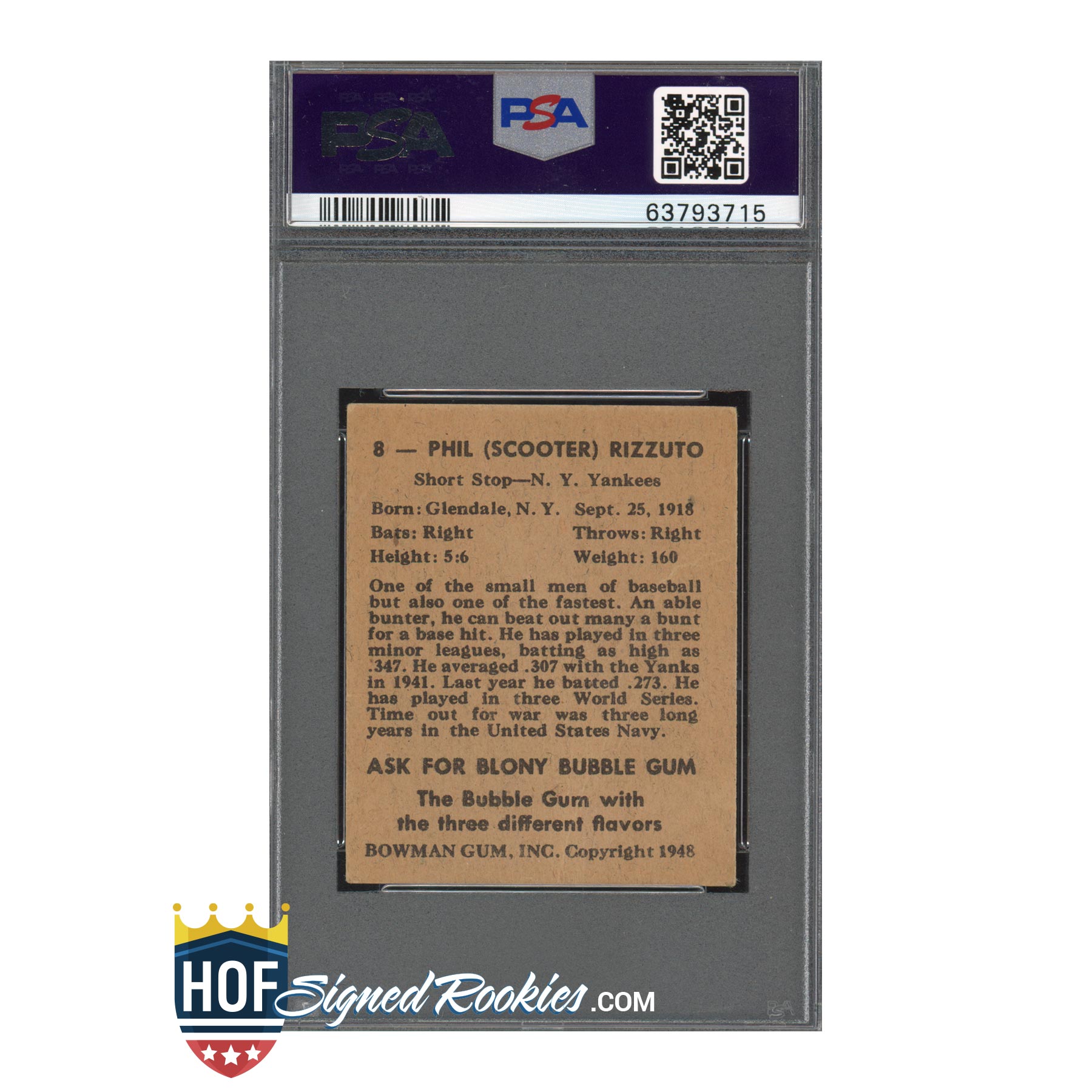 1948 Bowman #8 Phil Rizzuto RC – PSA Authentic, Auto 9 – Hall of Fame Signed Rookie – New York Yankees