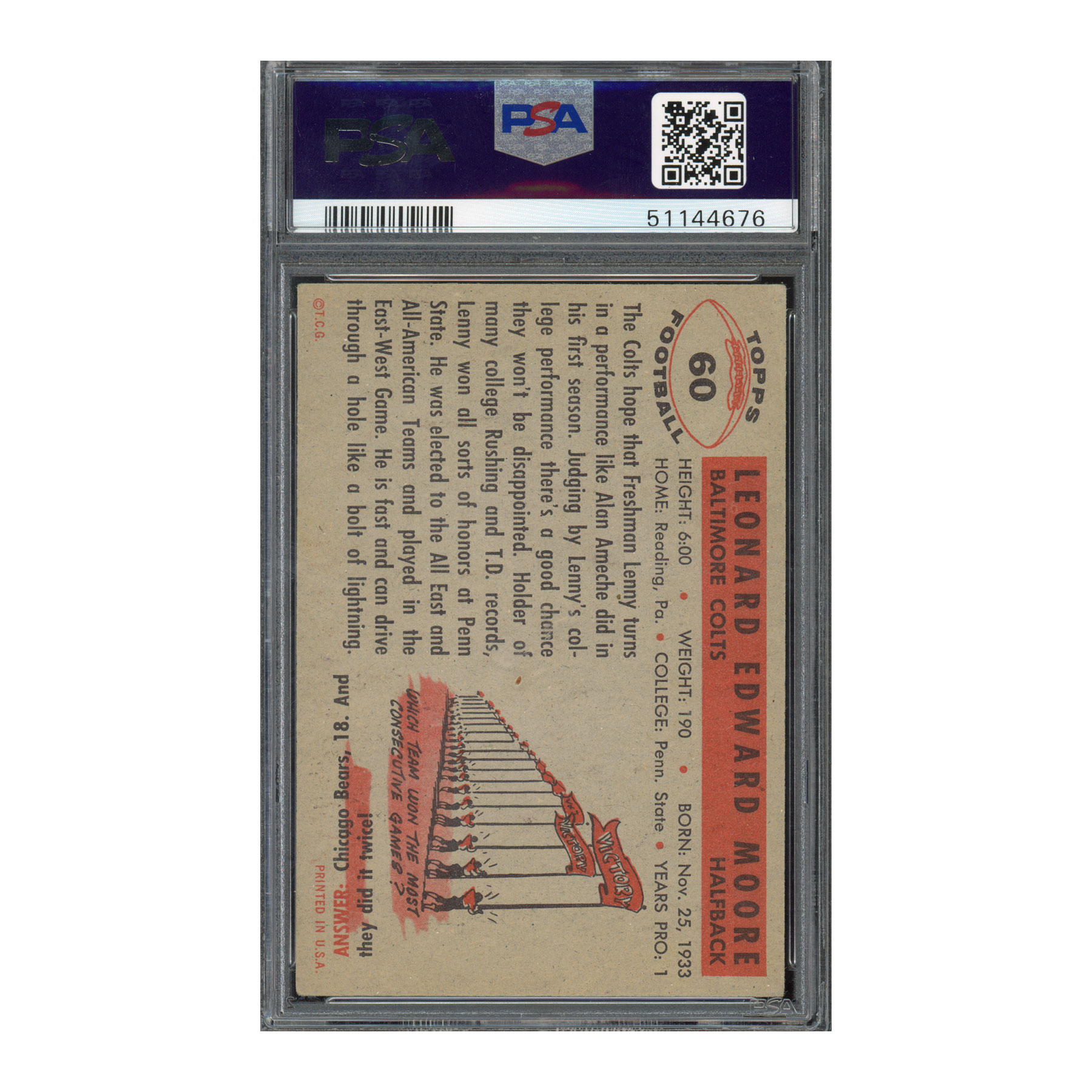 • Autograph: Authenticated and graded PSA Auto 10, ensuring Lenny Moore’s signature is of impeccable quality.