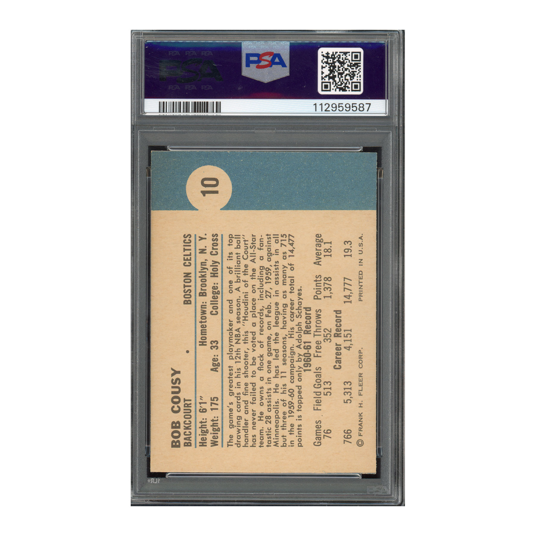 1961 Fleer #10 Bob Cousy – Signed – PSA 8, Auto 10 – Hall of Famer – POP 1; None Higher