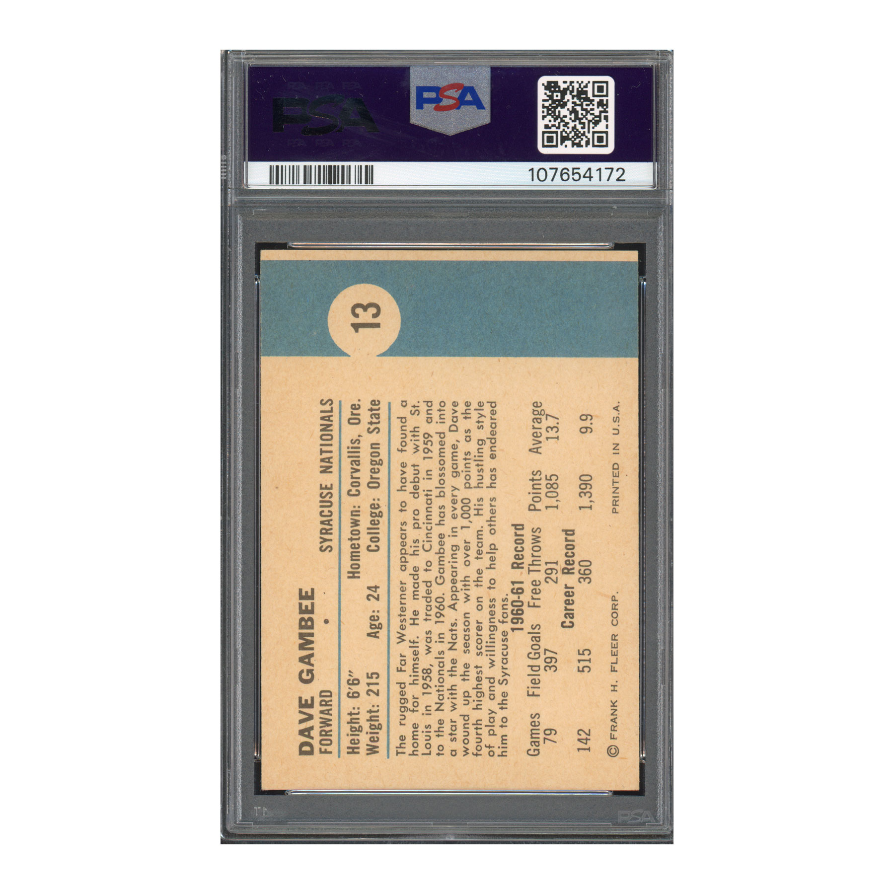 This 1961 Fleer #13 card features Dave Gambee in his rookie season. Graded PSA 7 (Near Mint) and boasting a perfect PSA/DNA 10 autograph, this vintage issue offers sharp corners, solid centering, and a crisp signature. A rare piece from an early Fleer basketball release.