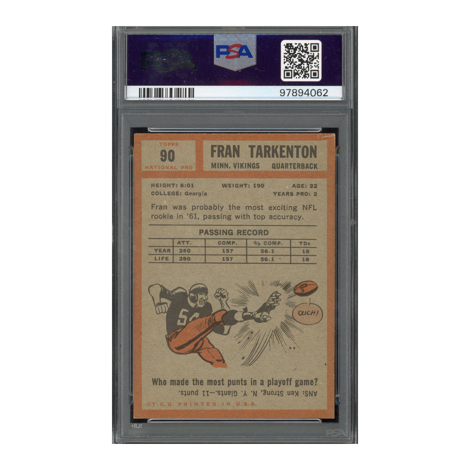 The 1962 Topps Fran Tarkenton rookie card is a must-have for football enthusiasts and collectors. With its historical significance, Tarkenton’s legendary status, and an authenticated autograph, this card stands as a premium addition to any collection.