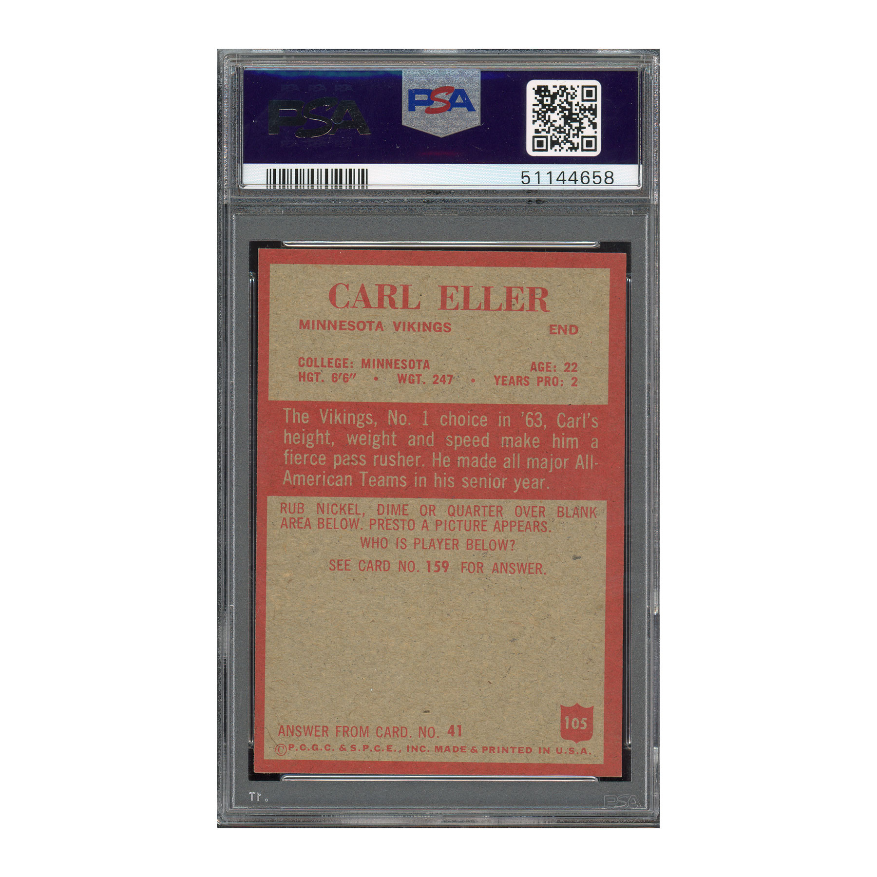 Celebrate the legacy of Carl Eller with this 1965 Philadelphia rookie card, an essential addition to any vintage football collection.