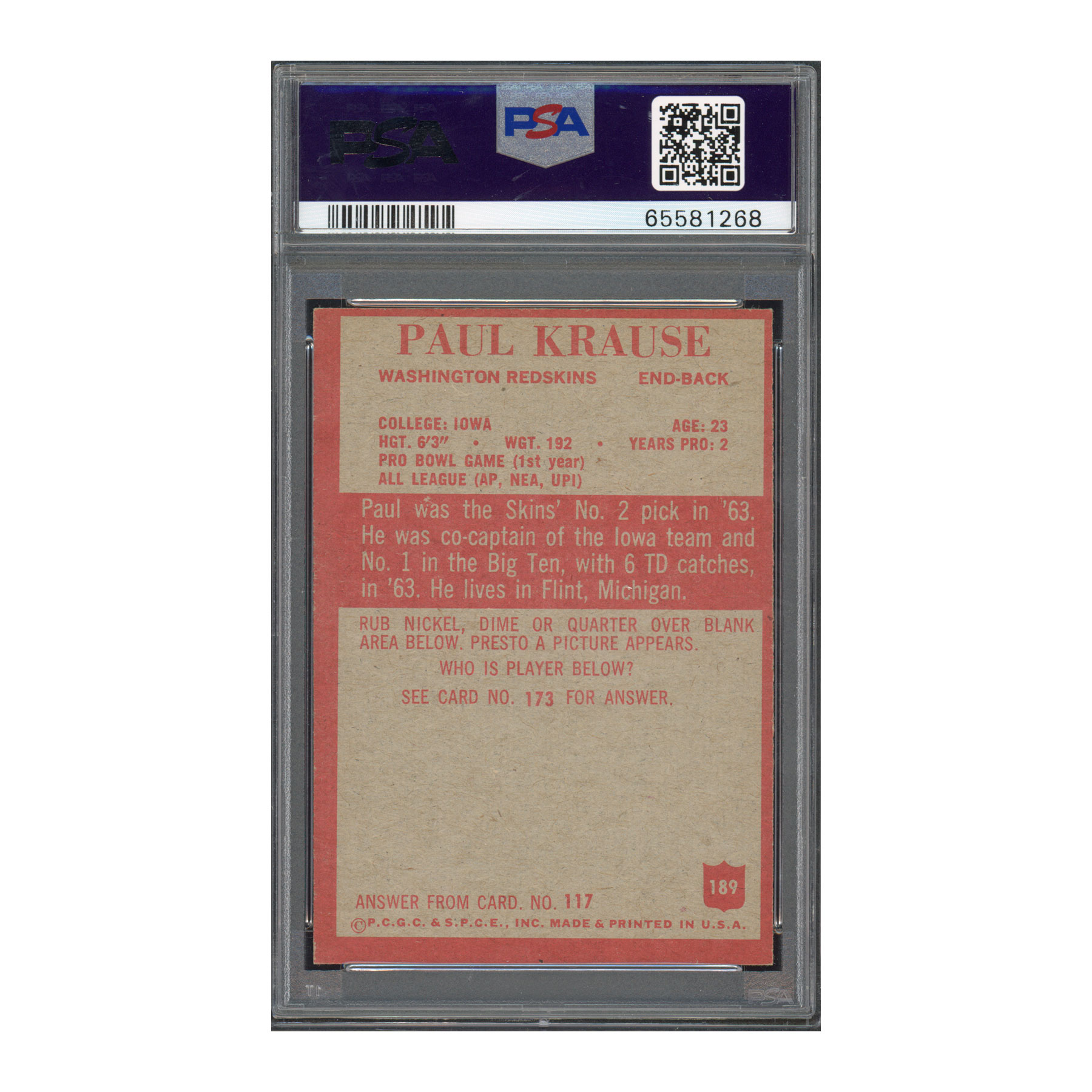 1965 Philadelphia #189 Paul Krause – PSA 6 EX-MT – Auto 10 – HOF Signed RC Rookie Autograph