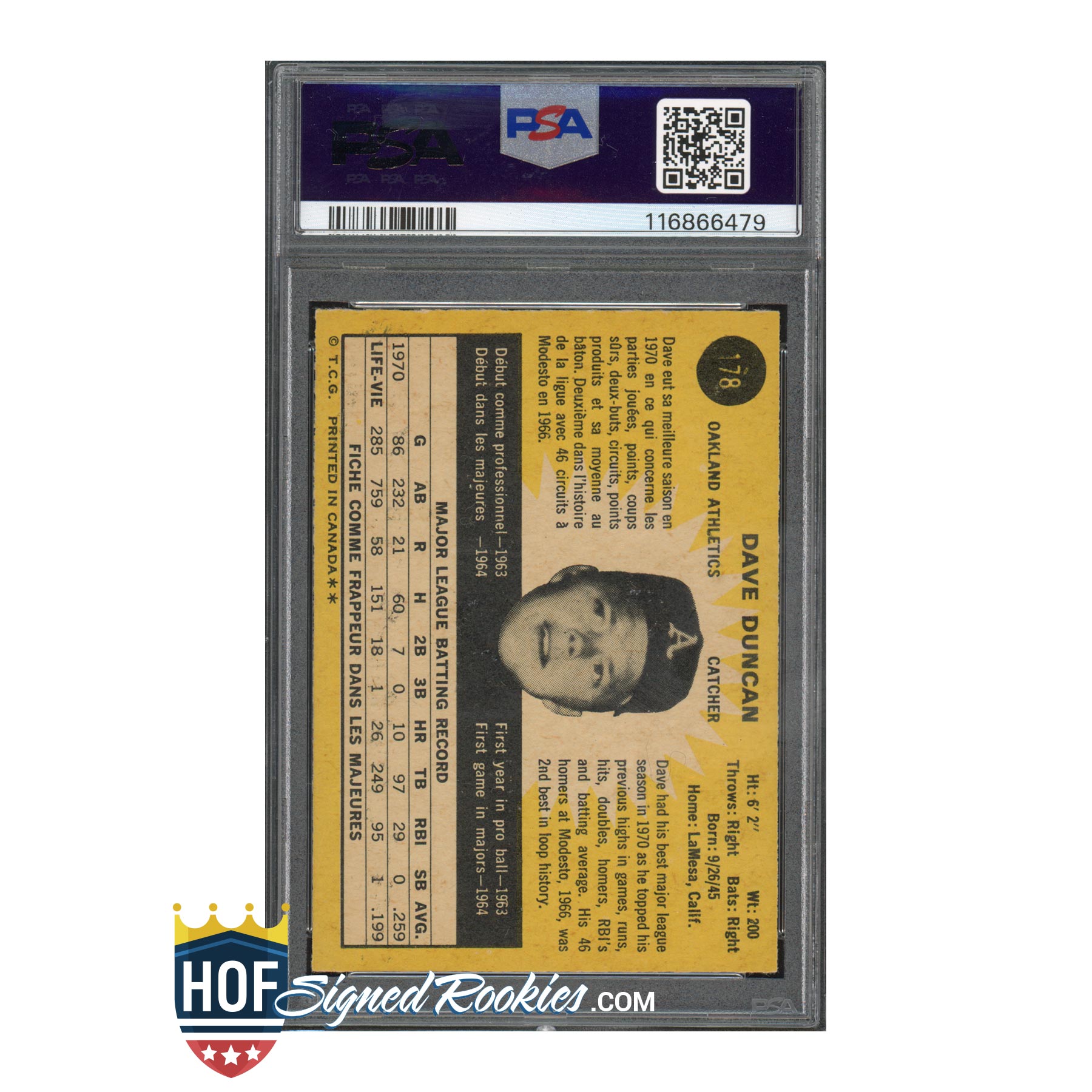 1971 OPC O-Pee-Chee Dave Duncan – PSA 6 Auto 10 – Signed Autograph
