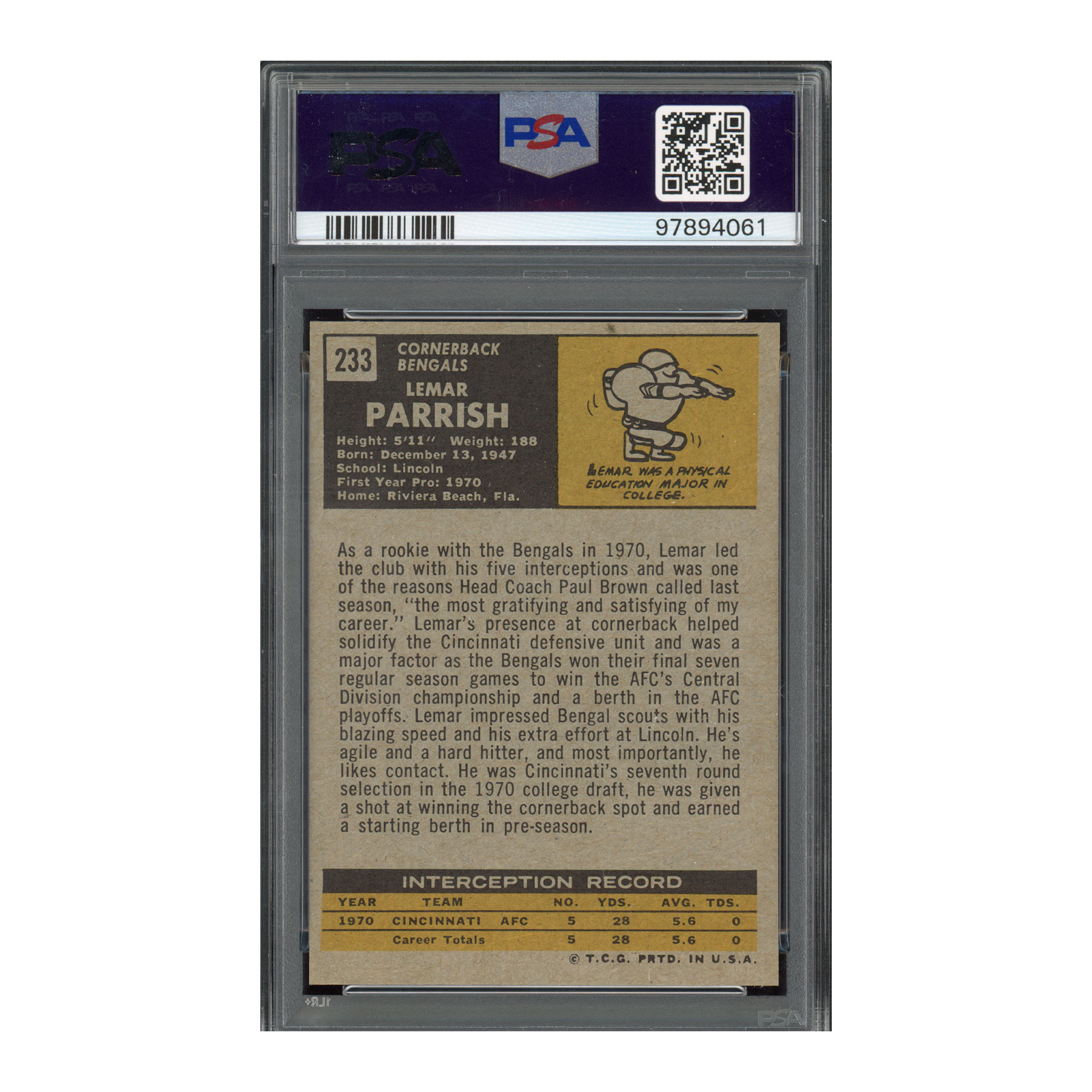 This 1971 Topps #233 Lemar Parrish PSA 7 Auto 10 Rookie Card is a standout collectible, combining the history of a rookie card with the added value of an authenticated, flawless autograph. A rare and valuable addition to any football collection.