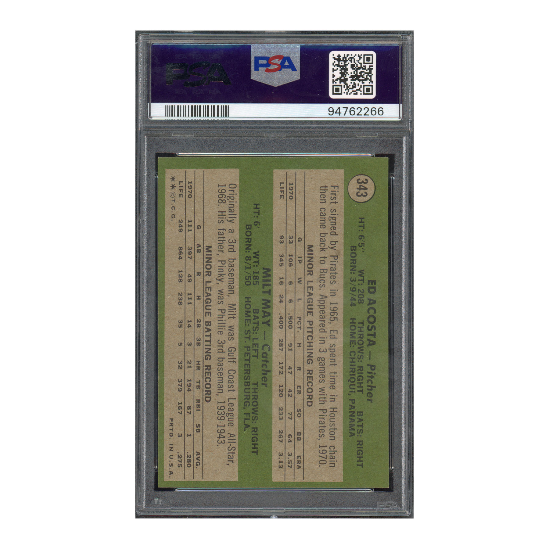 1971 Topps #343 Ed Acosta / Milt May – PSA 8 NM-MT – Near Mint+