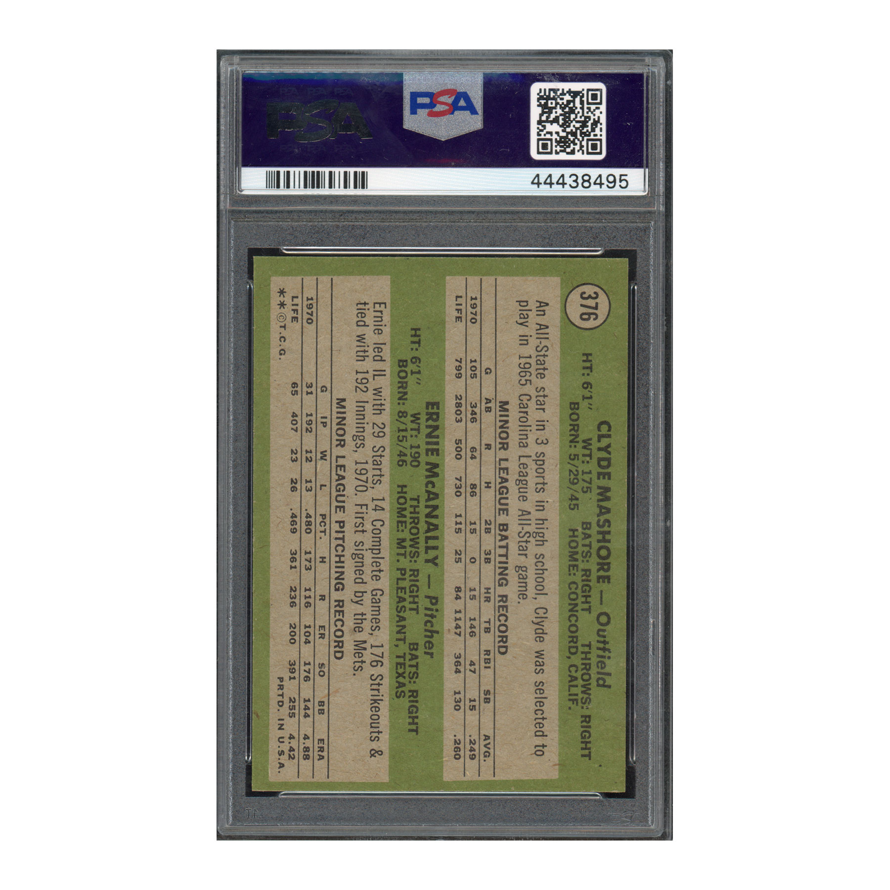 This 1971 Topps #376 card showcases rookie stars Clyde Mashore and Ernie McAnally of the Montreal Expos. Graded PSA 8 (Near Mint–Mint), the card is in excellent condition, reflecting its well-preserved state over the decades. The 1971 Topps set is renowned for its distinctive black borders, which are prone to showing wear, making high-grade cards like this one particularly desirable.