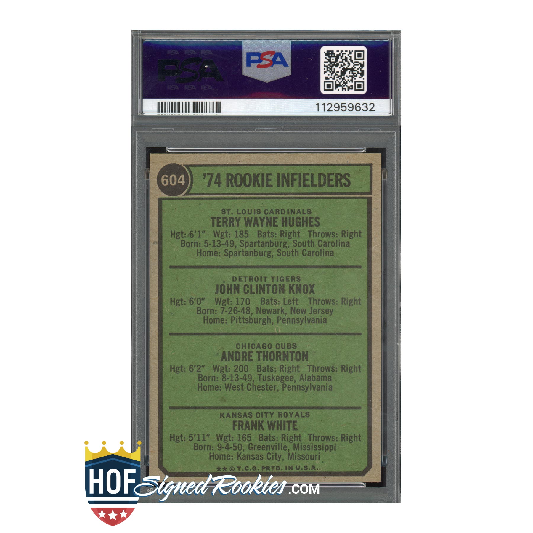 A vintage 1974 Topps card featuring four promising infielders: Terry Hughes, John Knox, Andy Thornton, and Frank White. Graded PSA 8 Near Mint-Mint with a perfect Auto 10 signature, this card showcases sharp corners, clean edges, and excellent centering. As a rookie card, it captures the early careers of these players, with Frank White going on to have a notable career with the Kansas City Royals.