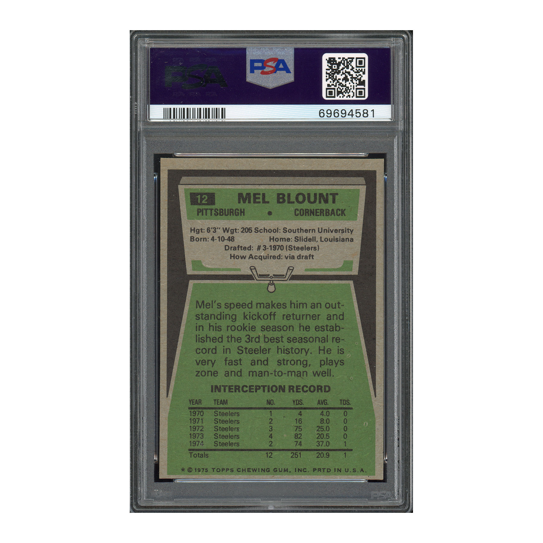 This 1975 Topps Mel Blount rookie card, graded PSA 8 (NM-MT) and featuring a PSA Auto 10 (Gem Mint) signature, is a remarkable piece for any football card collection. Mel Blount, one of the most dominant cornerbacks in NFL history, played an integral role in the success of the Pittsburgh Steelers during their 1970s dynasty. His unmatched skills and contributions to the game earned him induction into the Pro Football Hall of Fame in 1989.