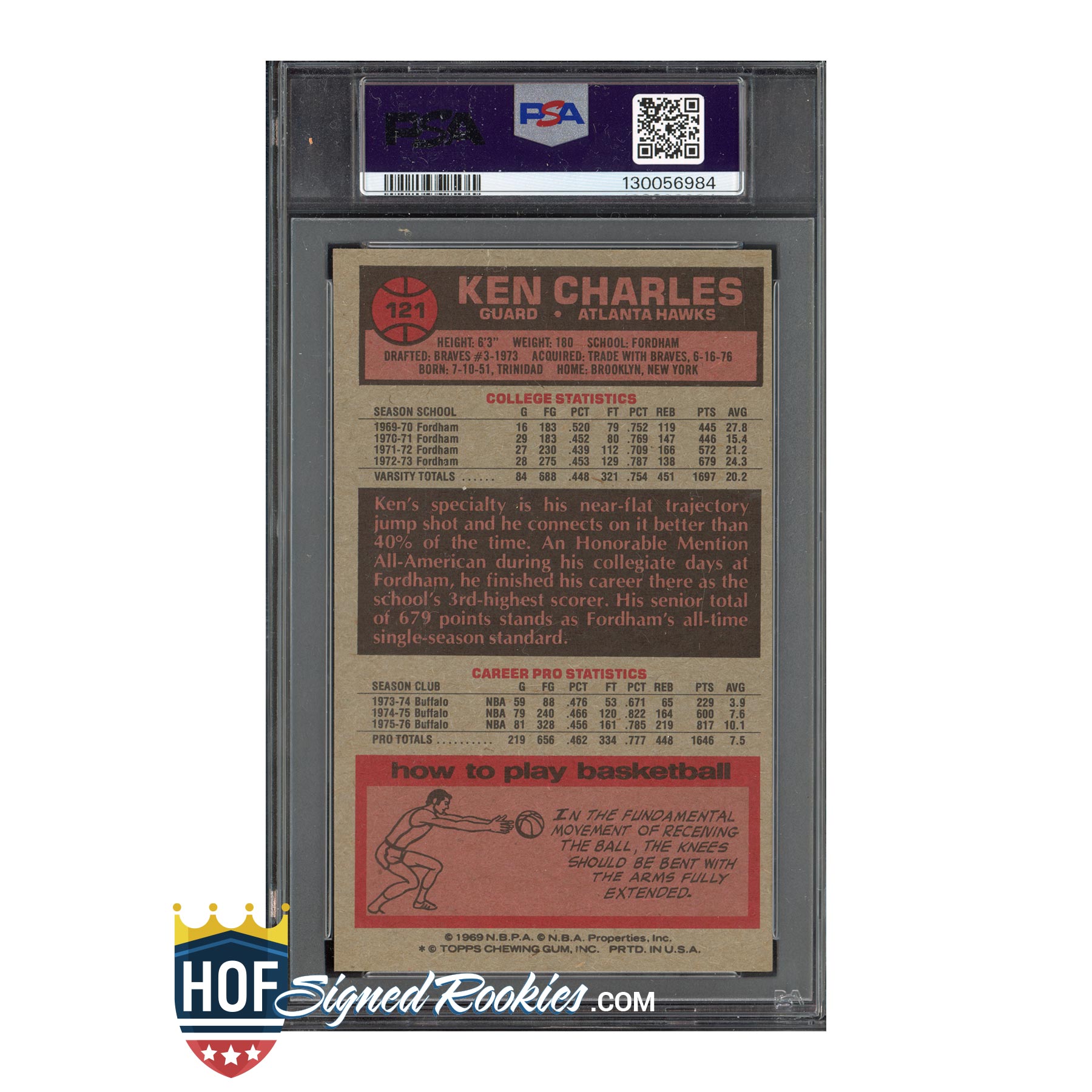 A high-grade signed example from the 1976 Topps Basketball set featuring Ken Charles. This classic mid-1970s Topps issue is known for its colorful design and growing popularity among vintage NBA collectors. Graded PSA 8 with a flawless Auto 10, the card offers excellent eye appeal with a bold, well-placed signature. Charles was a guard in the NBA during the 1970s, contributing as a reliable backcourt presence with teams including the Buffalo Braves and Atlanta Hawks.