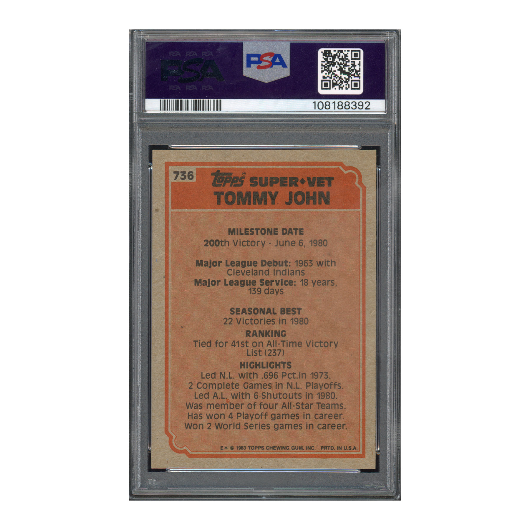 1983 Topps #736 Tommy John – PSA 9 MINT – Autographed