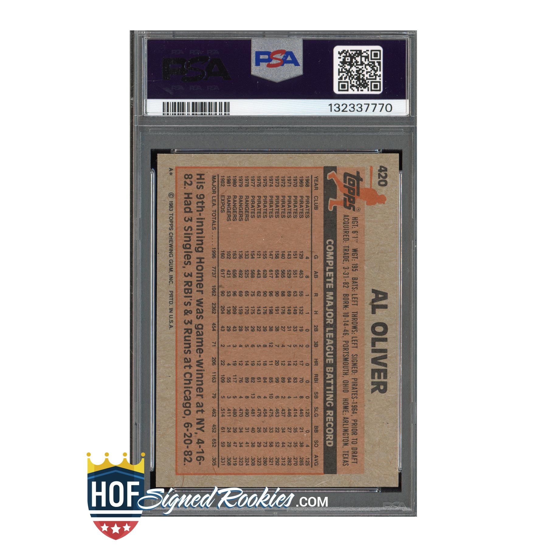 1983 Topps #420 Al Oliver – PSA 10 GEM MT Auto 10 – Signed Autograph – Pop 1