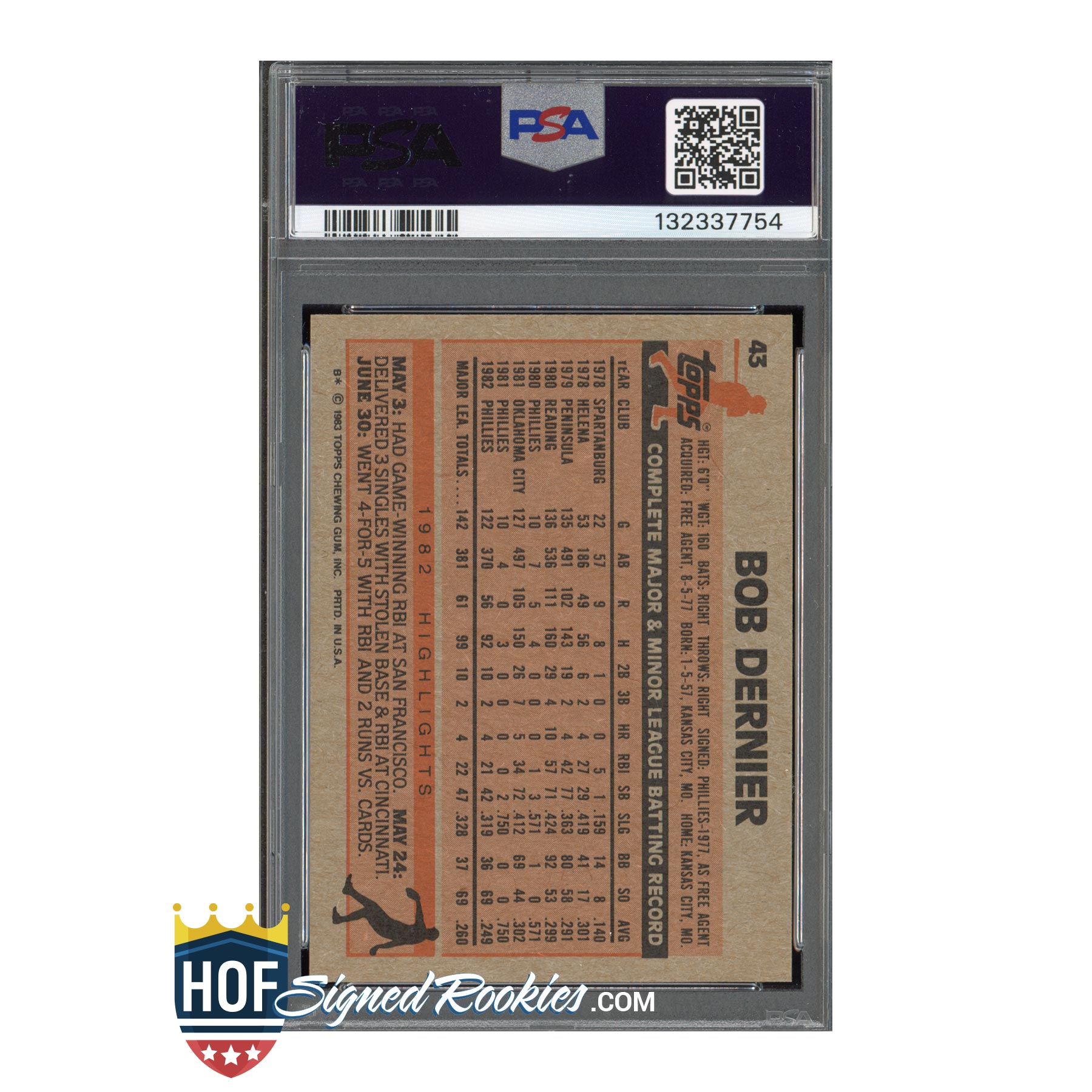 1983 Topps #43 Bob Dernier – PSA 10 GEM MT Auto 10 – Signed Autograph – Pop 1