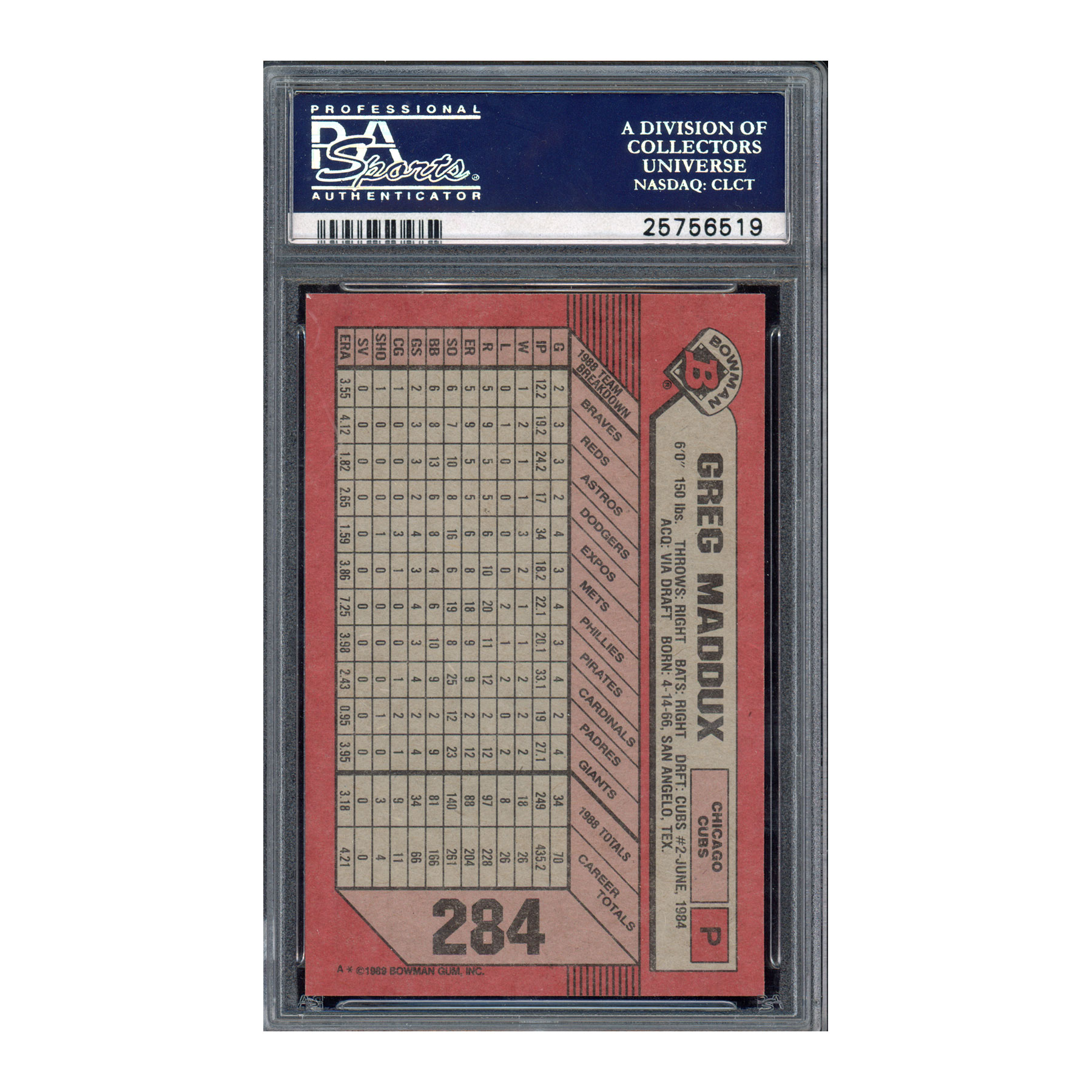 The 1989 Bowman set is a favorite among collectors for its nostalgic design and high-quality production. With its clean layout and vibrant photography, this card stands out in any collection, and a PSA 10 example of Maddux’s rookie-year card is particularly valuable given the high standards of the set.