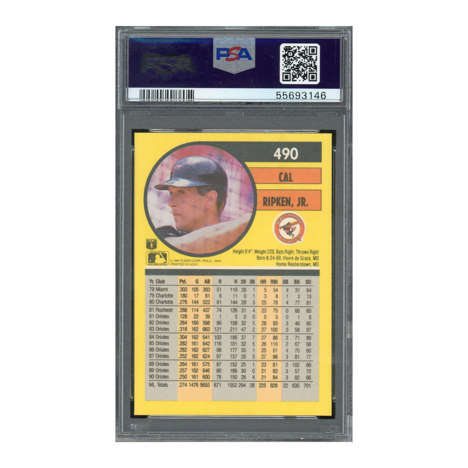 1991 Fleer #490 Cal Ripken – PSA 10 GEM MT – Orioles HOF