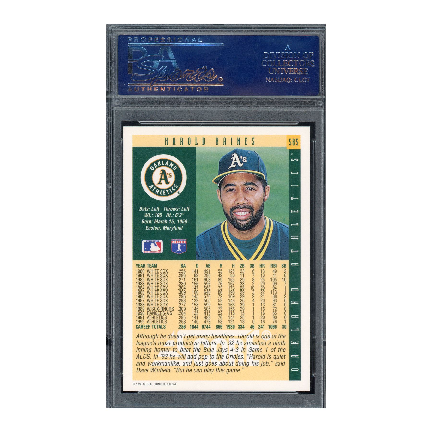 1993 Score #585 Harold Baines – PSA 10 GEM MT – Hall of Famer – POP 8