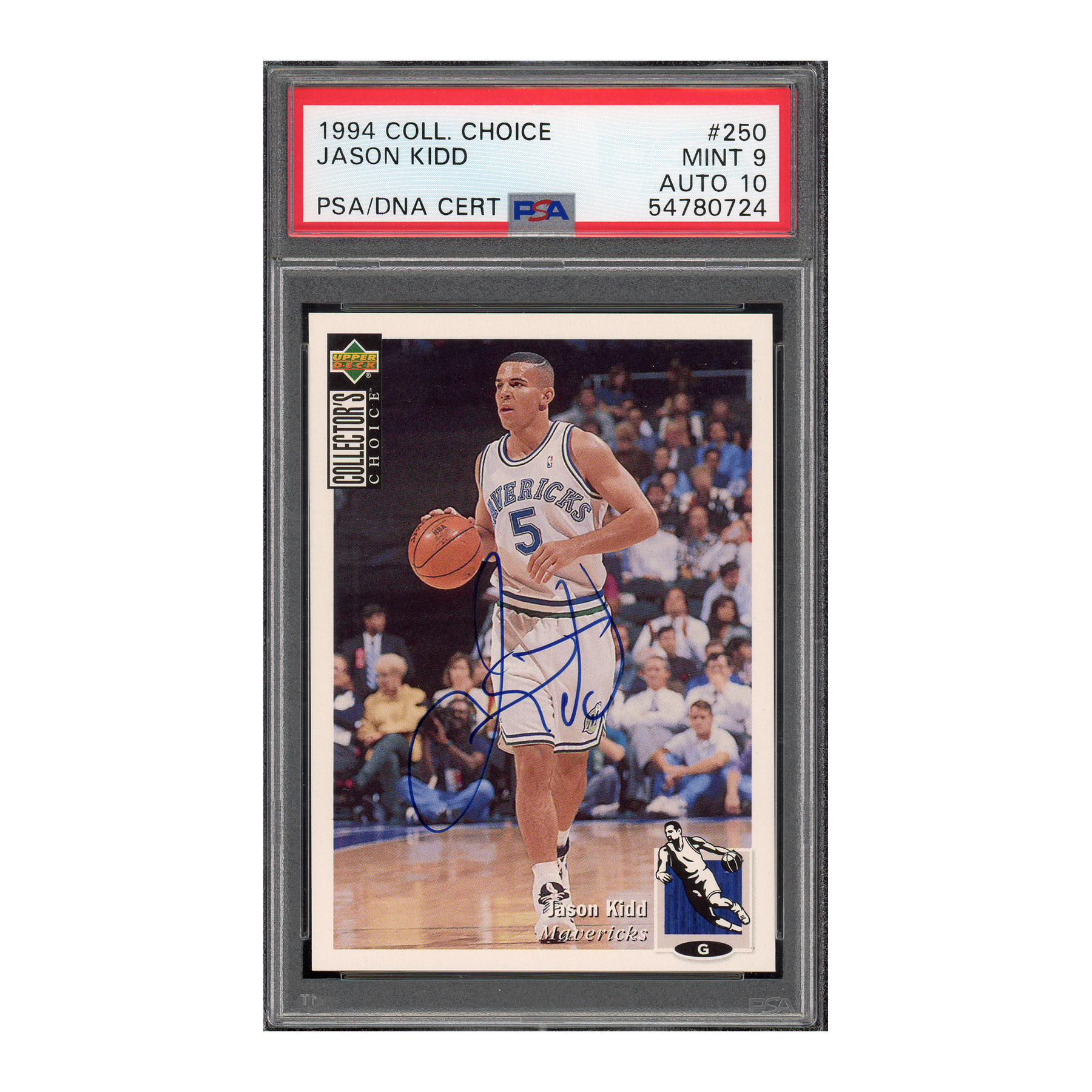 Take your collection to the next level with this 1994 Collectors Choice Jason Kidd rookie card, graded PSA 9 (Mint). Jason Kidd, one of the greatest point guards in NBA history, was known for his exceptional passing, leadership, and basketball IQ. As a 10-time NBA All-Star and Hall of Fame inductee, Kidd revolutionized the point guard position with his all-around game, making this rookie card an essential piece for any serious basketball card collector.