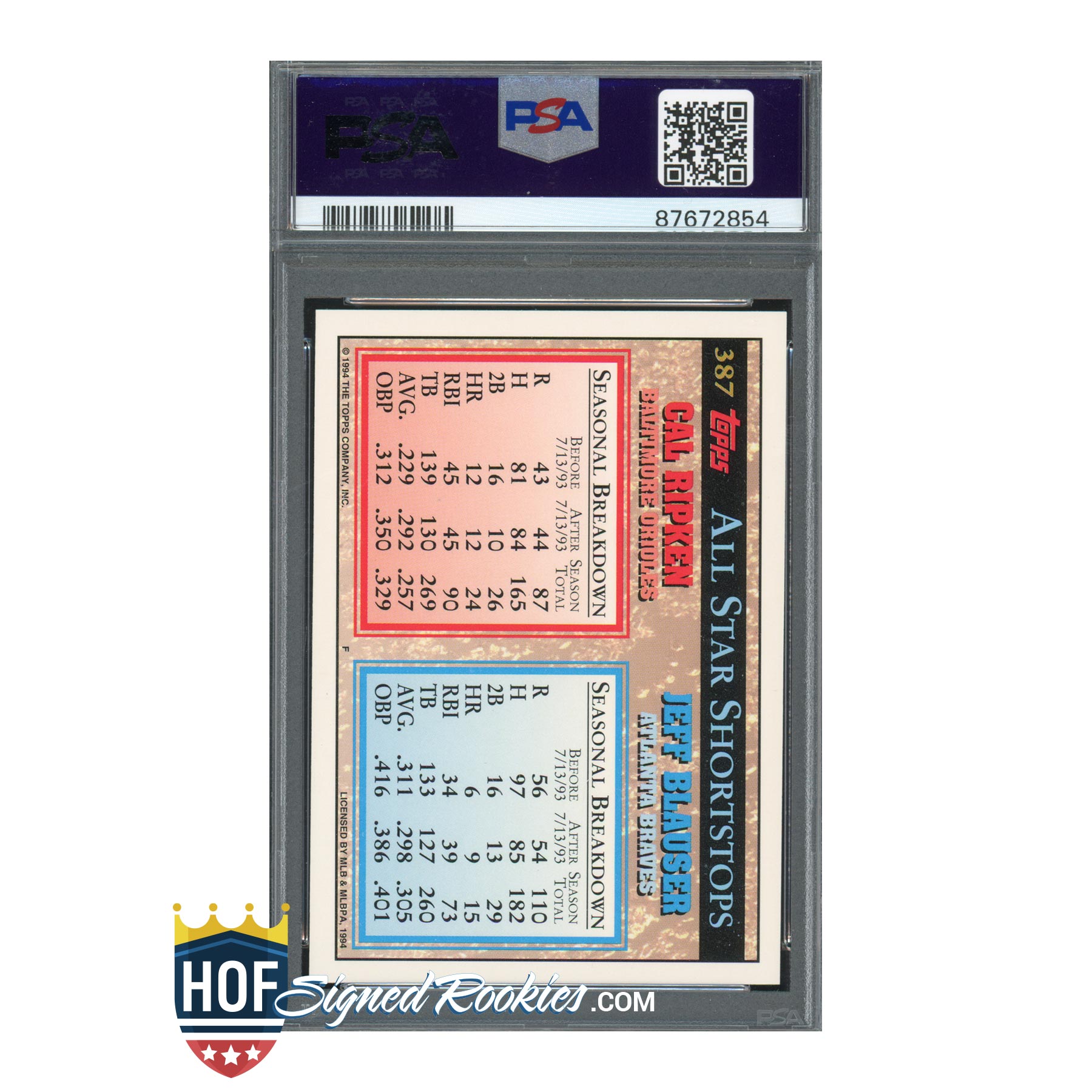 1994 Topps Gold #387 Cal Ripken Jr. / Jeff Blauser – PSA 10 GEM MT – Hall of Famer – Baltimore Orioles