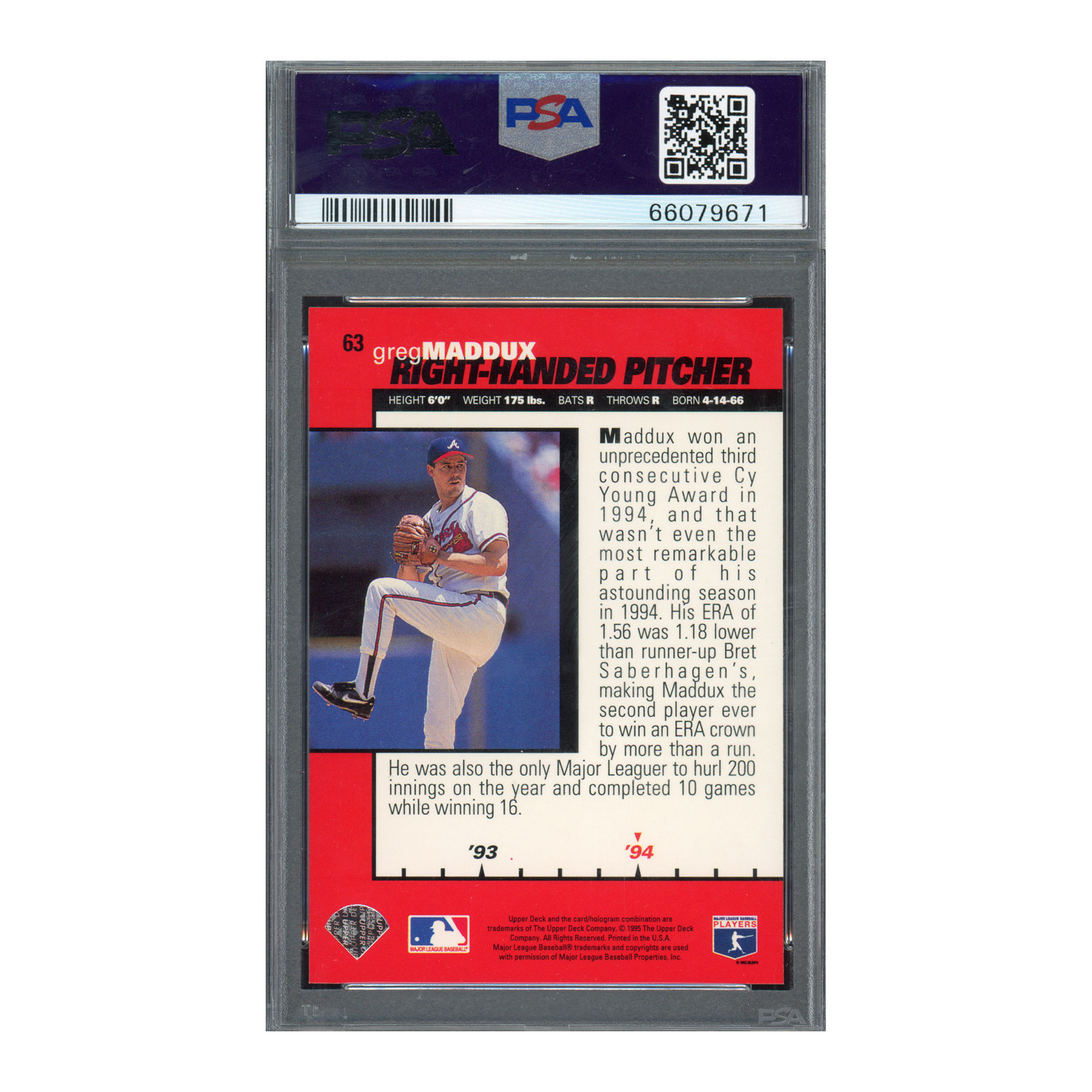 1995 Collector’s Choice #63 Greg Maddux – PSA 10 GEM MT – Braves HOF – Pop 19
