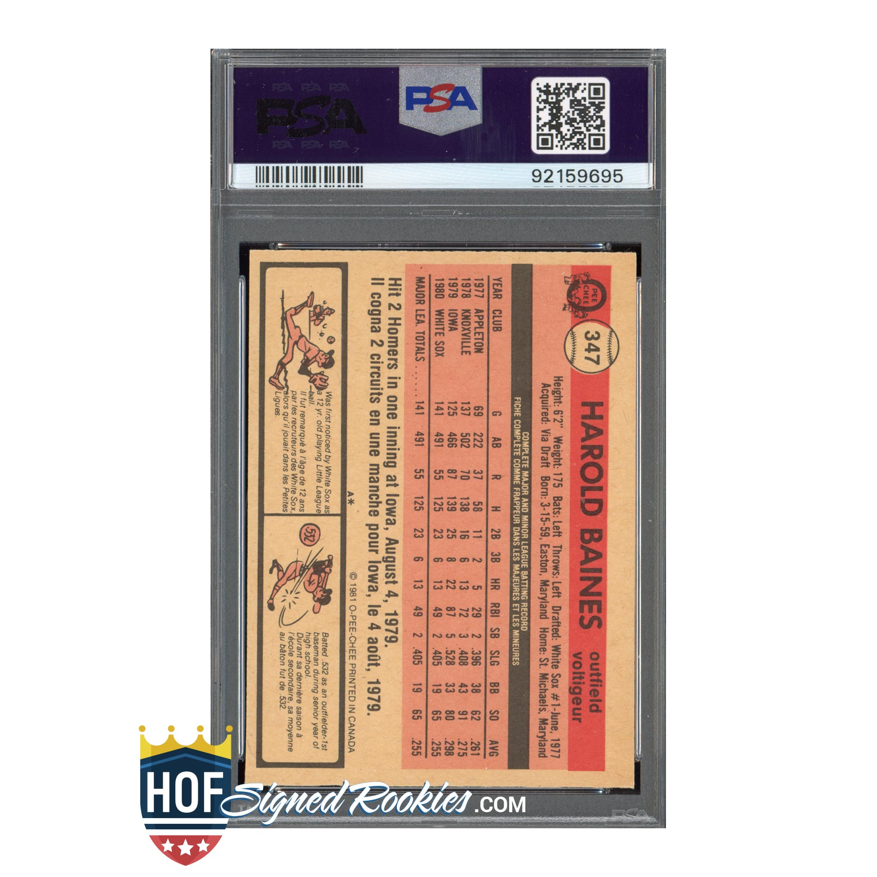 1981 O-Pee-Chee #347 Harold Baines – PSA 7 Auto 10 – HOF Signed Rookie Autograph – Pop 1 (1 Higher)